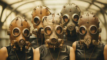 Vintage photo of old mannequins wearing gas masks.