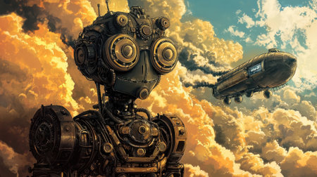 A steampunk robot stands against a dramatic sunset sky filled with clouds, observing a vintage airship sailing through the air, showcasing an imaginative world.