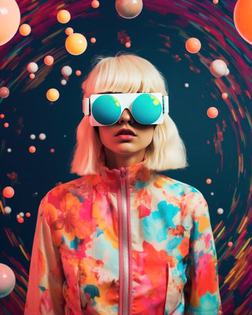 Chic woman with oversized futuristic glasses against a swirling neon backdrop, embodying a vibrant and edgy aesthetic. The ultimate modern fashion statement. Generated A.I.