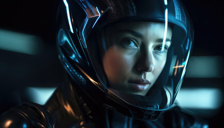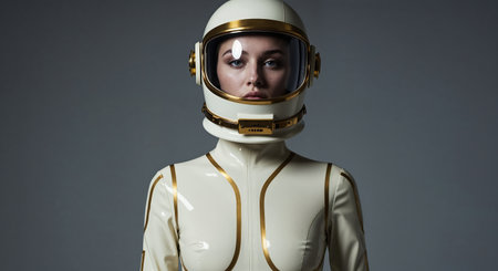 This captivating studio portrait features a female wearing an elegant, form-fitting space suit with metallic gold details, embodied a vision of advanced exploration.