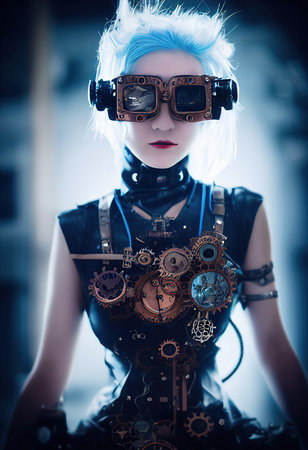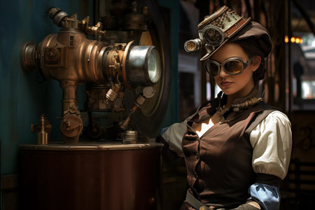 Portrait of beautiful steampunk woman engineer wearing goggles standing nearby futuristic bronze mechanical machine. Generative AI