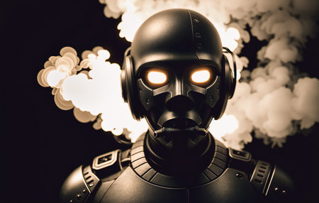 An intimidating and menacing robot or cyborg on a black smoky background