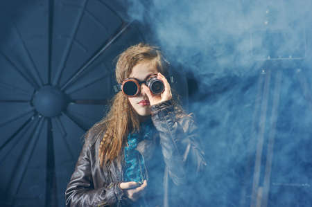 Beautiful steampunk teen girl in goggles with old cameral, model in the style of a steampunk in a beautiful creative studio. Fashion, style