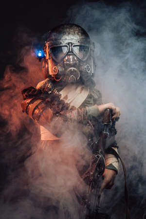 Environmental disaster. Post-apocalyptic survivor in gas mask on a dark background. Dramatic portrait of a man wearing a gas mask. Means for radiation protection. Selective focus