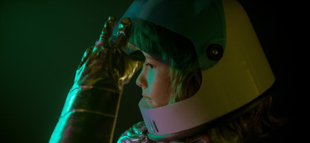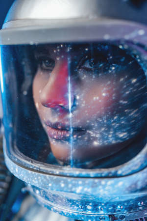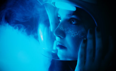 Female cosmonaut inside studio room with cosmic light