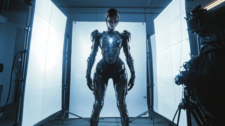 In a well-lit studio, a model displays an elaborate sci-fi armor costume, complete with metallic textures and high-tech details,