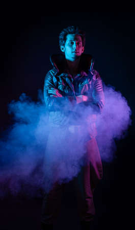 A guy in a cyberpunk image, a futuristic character in smoke. A young man in neon lighting on a black background