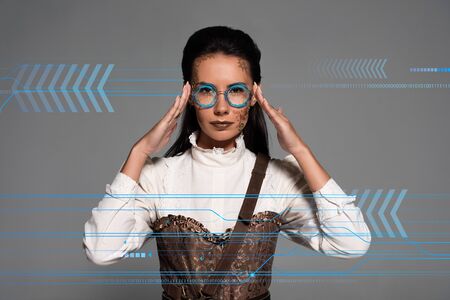 steampunk woman touching glasses isolated on grey with data illustration