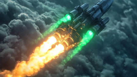Rocket launches into the clouds with bright flames and green lights at nighttime