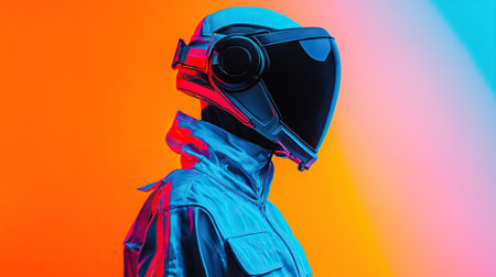 Futuristic figure in sleek outfit against vibrant colors and bold lighting
