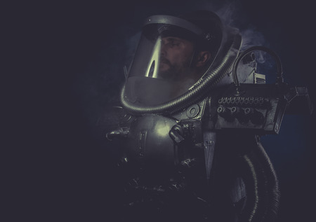 Pollution, spaceman with plasma gun and helmet glass