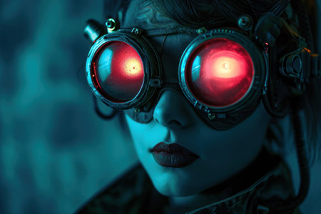 A young man poses with goggles that reflect vivid red light, creating a striking contrast against the blue backdrop. His serious expression and the colorful lighting create a captivating atmosphere.