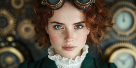 Steampunk woman with goggles and curly red hair