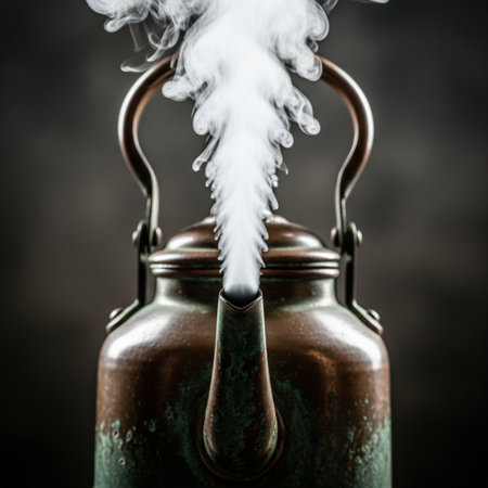 Close-up view of metallic kettle boiling on electric stove