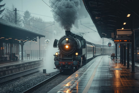 A train pulling into a station with steam billowing out created with Generative AI