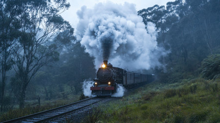 A steam locomotive chugs along the tracks, releasing clouds of steam as it navigates through a misty forest. This scene captures the essence of travel and exploration in nature.