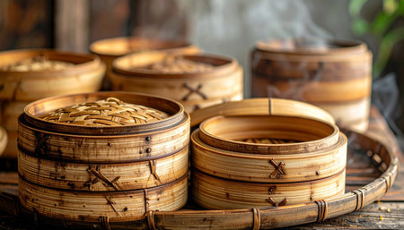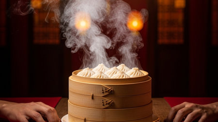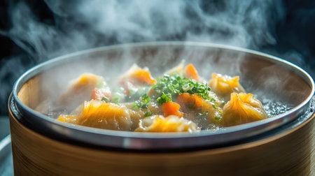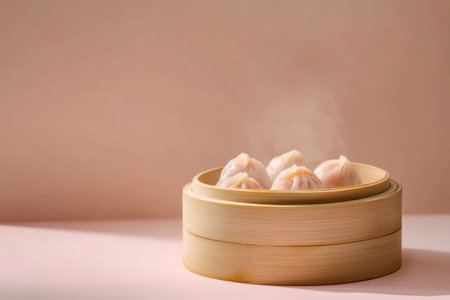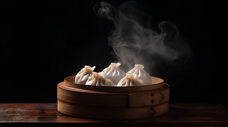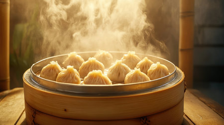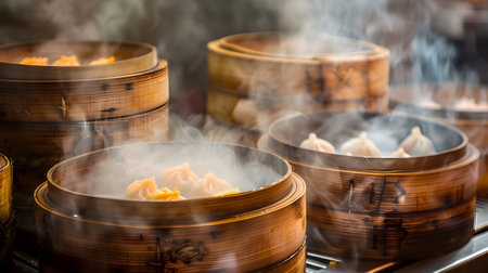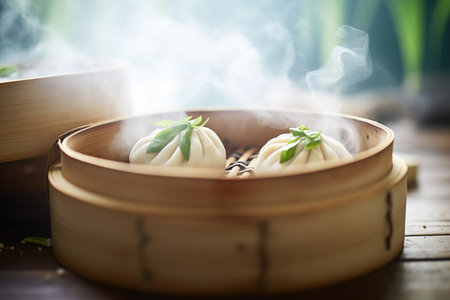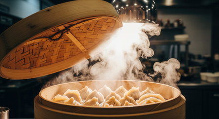 steaming process of dim sum in a traditional bamboo steamer, created with generative ai