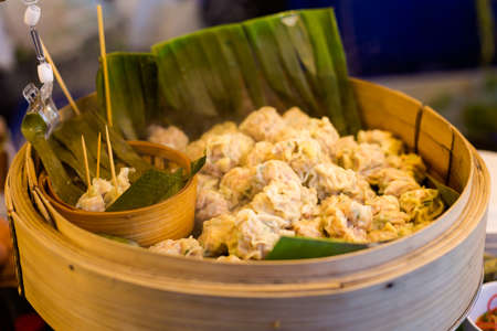 Fresh prepared asian steamed selection of dimsum dumplings on local market in Bangkok. Traditional thai cuisine made of fresh ingredients.