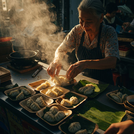 Asian old woman cooking dumplings at street food market in Bangkok, Thailand