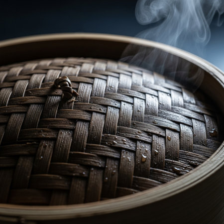 A bamboo steamer sits on a stovetop emitting steam, creating a warm and inviting atmosphere. Perfect for showcasing Asian cooking and culinary practices.