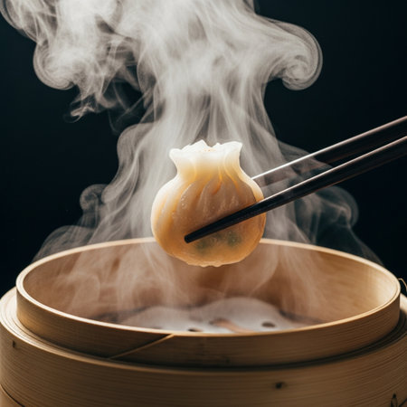 Steaming dumplings being taken out of a bamboo steamer, traditional Asian kitchen atmosphere
