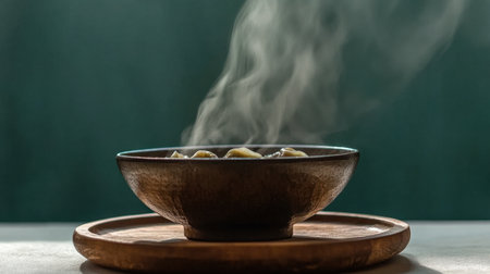 Steaming ceramic bowl on gray table against dark background