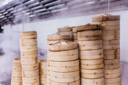 Piles of stacking bamboo steamers are steaming for dim sum.