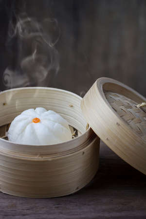 Chinese steamed bun in bamboo ware on wooden table