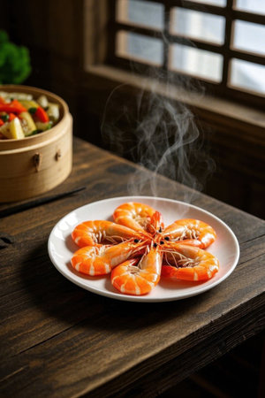 Steaming white burned shrimp on a wooden table