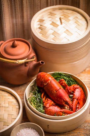 Fresh steamed lobster in bamboo steamer