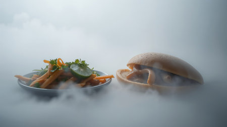 Hamburger with vegetables on a plate in the foggy morning