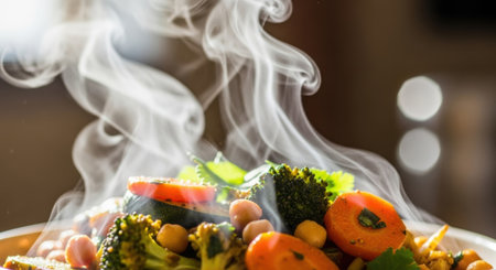 Steaming vegetables: healthy cuisine with broccoli, carrots, and chickpeas in warm light. High quality illustration