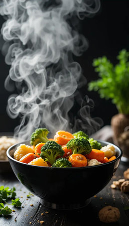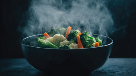 A vibrant arrangement of fresh steamed vegetables, including broccoli, carrots, and cauliflower, emitting steam in a dark bowl, perfect for showcasing healthy cuisine.