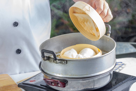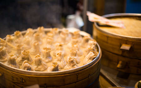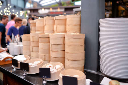 Asian Culture Street food booth selling Chinese specialty Steamed Dumplings preparation cooking in a bamboo basket