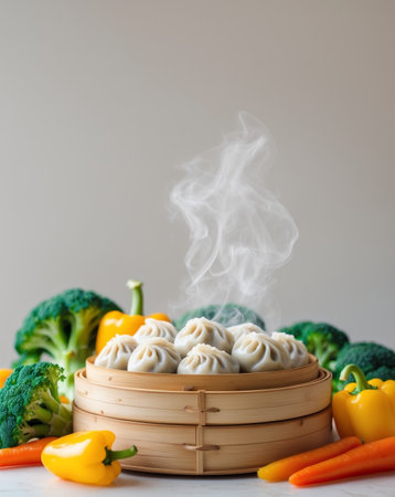 AI Generated. Assorted Dumplings in Bamboo Steamer with Fresh Vegetables