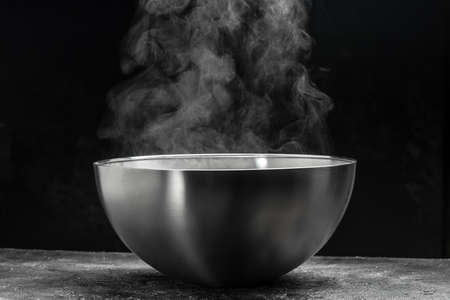 Steaming metal bowl on gray table against dark background
