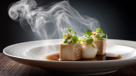 Discover the beauty of an elegantly presented tofu dish, adorned with fresh herbs and aromatic steam, capturing the essence of contemporary culinary artistry.