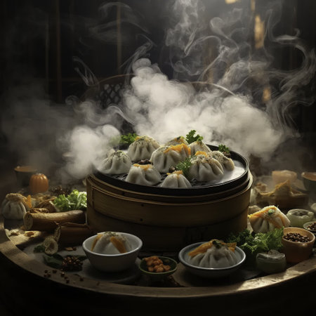 A visually striking image of freshly steamed dumplings in a bamboo steamer with steam rising, flour dust in the air, creating an appetizing and inviting atmosphere.