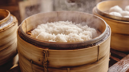 A steaming bamboo basket filled with fluffy white rice, showcasing comfort and warmth. Perfect for Asian cuisine and traditional cooking themes.