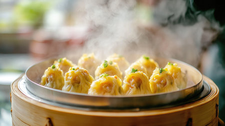 A steaming bamboo steamer filled with an assortment of siu mai and bao, capturing the delicate steam rising and the fresh ingredients used in the preparation