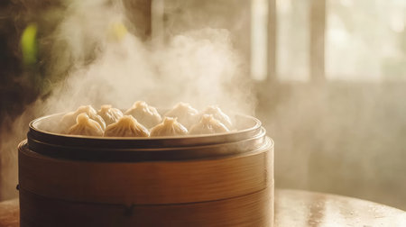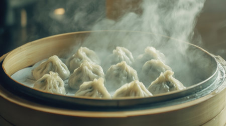 A close-up of freshly steamed dumplings in a bamboo steamer, showcasing culinary artistry and inviting warmth perfect for any dining occasion.