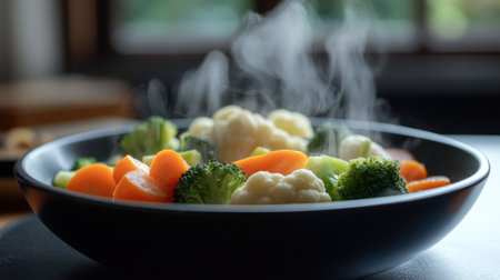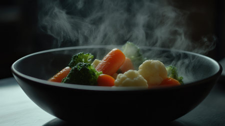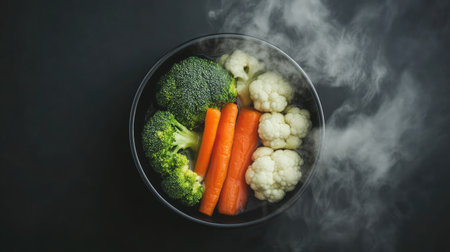A vibrant black bowl filled with fresh broccoli, carrots, and cauliflower, emitting steam. This nutritious arrangement highlights healthy eating and colorful vegetables.