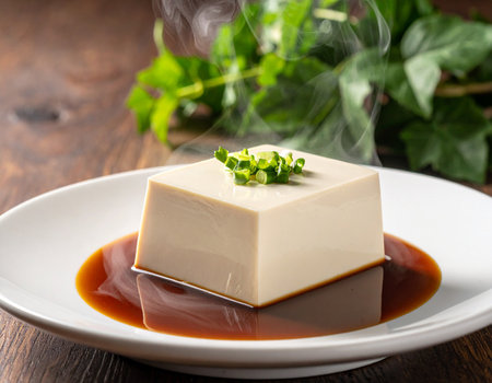 A beautifully arranged silken tofu dish drizzled with soy sauce, topped with fresh scallions and aromatic garnishes, showcasing simplicity and taste.