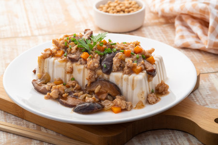 Soft Tofu with pork gravy sauce,Steamed soy bean tofu curd with minced pork carrot onion and shiitake mushroom in gravy sauce