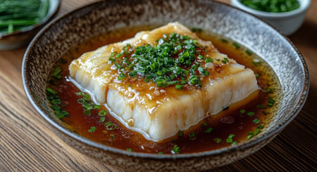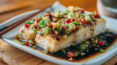 This image showcases a beautifully presented dish of steamed tofu, topped with sweet sauce and herbs. Perfect for food lovers and culinary enthusiasts.
