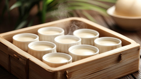 A quaint arrangement of steaming custard cups in a bamboo steamer, showcasing the art of traditional Asian desserts. Perfect for food lovers and chefs.