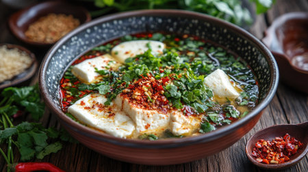 A delicious bowl of tofu in a rich red sauce, topped with herbs, is set on a wooden table.