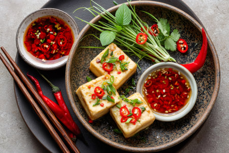 Flavorful fried tofu seasoned with spicy chili sauce, sesame seeds, and fresh herbs, creating a delicious and healthy meal