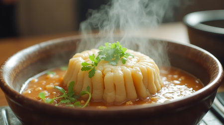 A steaming bowl of Lunar New Year dish features a unique centerpiece surrounded by a flavorful soup, garnished with fresh herbs, creating a warm celebration of culture and tradition.