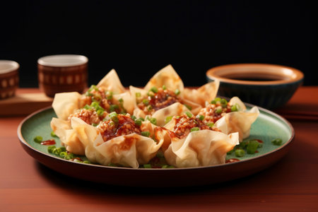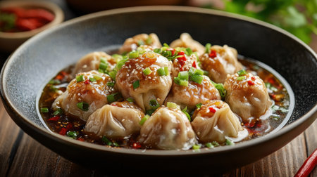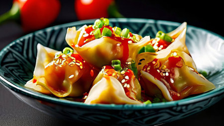 Delicious Asian Dumplings in Spicy Sauce - Perfect for Food Blogs and Culinary Designs